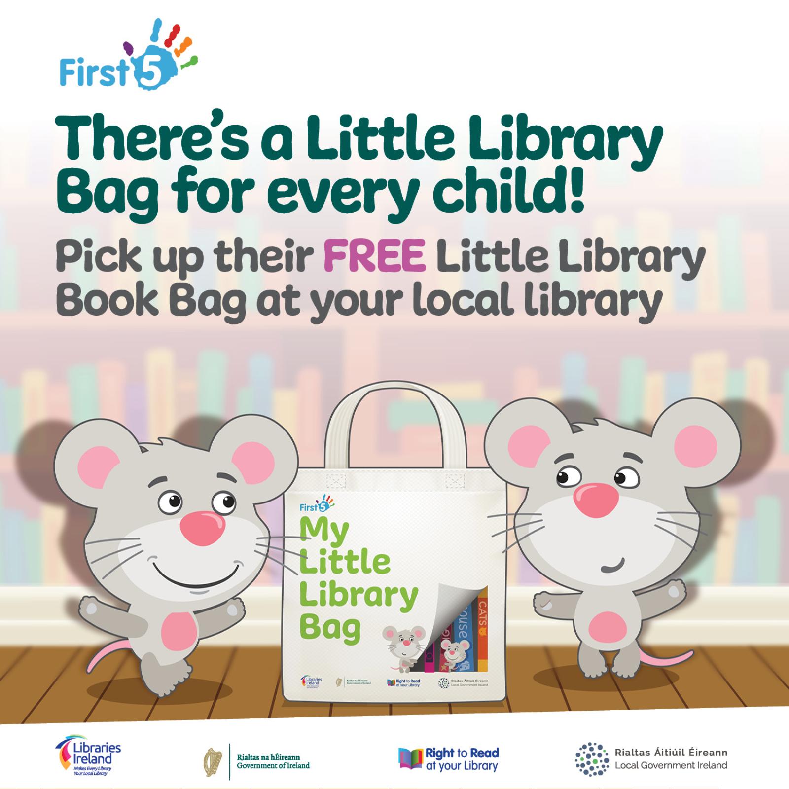 The ‘My Little Library Book Bag’ initiative is a collaboration between libraries, the Department of Rural and Community Development, and the Department of Children, Equality, Disability, Integration and Youth as part of the First 5 Strategy.